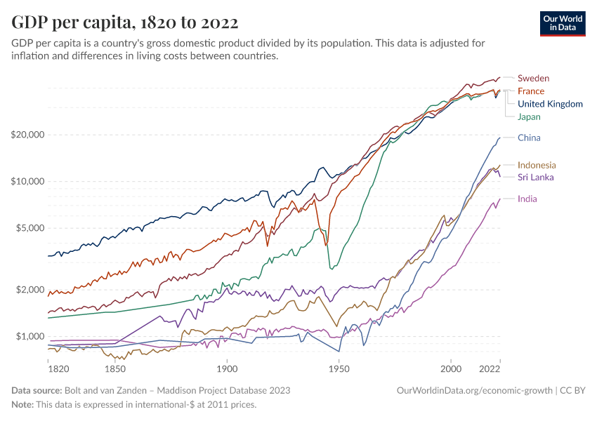 It is also worth keeping in mind that this change has happened while the world population increased 5-fold. Had total global production not increased, the GDP per capita would have declined 5-fold.