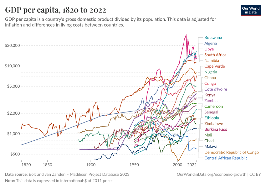 For Africa, we have fewer historical estimates. As shown in the second chart, within the Maddison Project Database, estimates prior to 1950 are only available for a small number of countries.