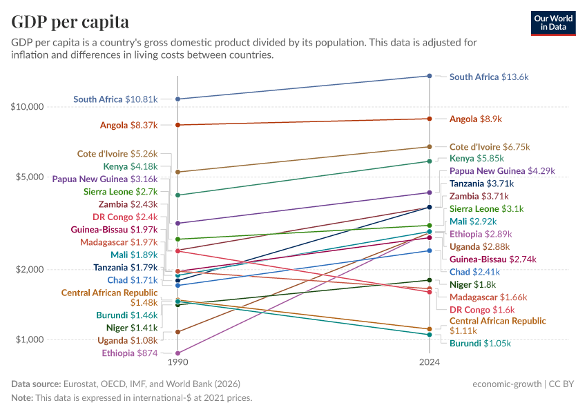 “Data Page: GDP per capita”, part of the following publication: Max Roser, Bertha Rohenkohl, Pablo Arriagada, Joe Hasell, Hannah Ritchie, and Esteban Ortiz-Ospina (2023) - “Economic Growth”. Data adapted from Eurostat, OECD, and World Bank. Retrieved from https://data-korevaar-housing.owid.pages.dev:8789/20250704-091220/grapher/gdp-per-capita-worldbank.html [online resource] (archived on July 4, 2025).
