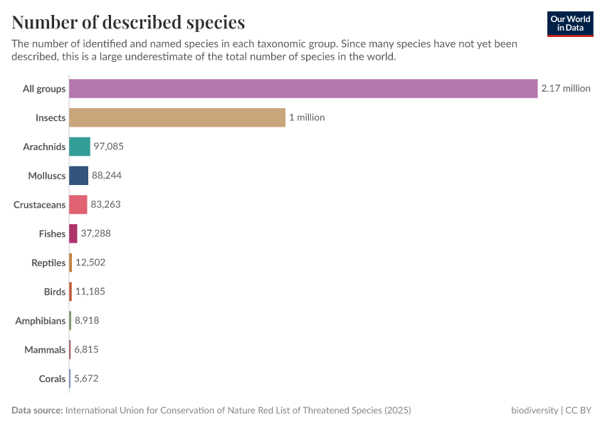 The IUCN Red List tracks the number of described species and updates this figure annually based on the latest work of taxonomists. In 2022, it listed 2.16 million species on the planet. In the chart, we see the breakdown across a range of taxonomic groups — 1.05 million insects, over 11,000 birds, over 11,000 reptiles, and over 6,000 mammals.