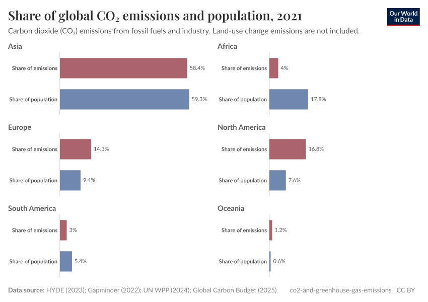Europe, North America and Oceania all emit more than their ‘fair share’ based on population, whereas Africa and South America emit less.
