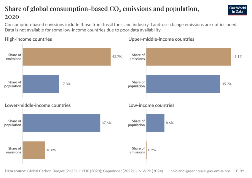 The emissions shares of lower-middle and especially low-income countries could be slightly underestimated; this is because consumption-based emissions cannot be calculated for some poorer countries due to poor data availability.