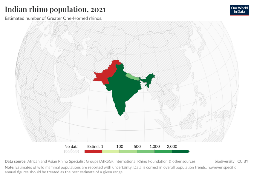 By the mid-20th century, there were very few Indian Rhinos left in the world. It’s estimated (with larger uncertainty since it predates regular surveying) that there were only 40 individuals left.