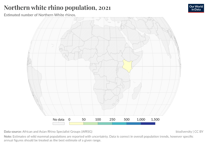 In the chart we see its demise over the second-half of the 20th century. In 1960, it’s estimated there were more than 2,000, predominantly in Sudan and the Democratic Republic of Congo. Intense poaching, and challenges for protection during civil unrest in stronghold countries, has led to a rapid decline.