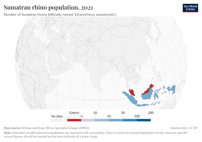 Once found in both Malaysia and Indonesia, the Sumatran Rhino is thought to be extinct in Malaysia; none have been recorded in 2016 and 2018 surveys.