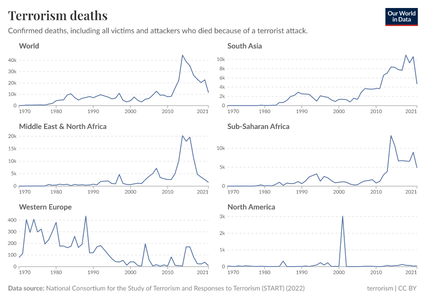 Bastian Herre, Veronika Samborska, Hannah Ritchie, and Max Roser (2023) - “Terrorism” Published online at OurWorldinData.org. Retrieved from: 'https://data-korevaar-housing.owid.pages.dev/terrorism' [Online Resource]BibTeX citation
